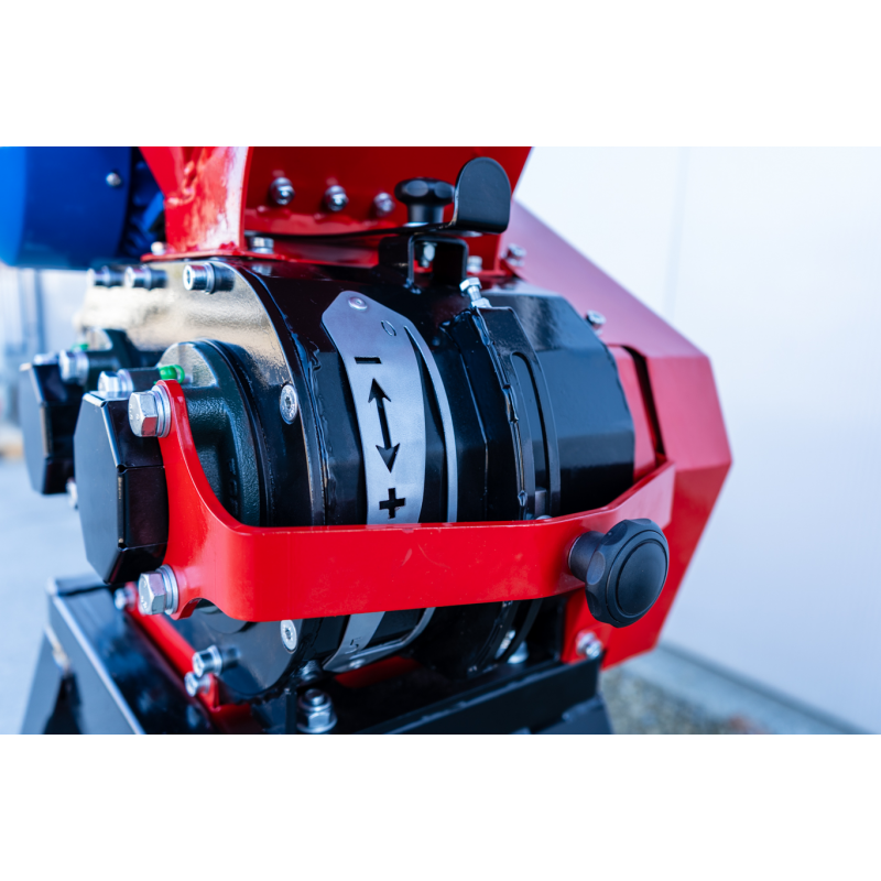 Kolejną cechą gniotownika jest ulepszony system regulacji szczeliny międzywałowej, który opiera się na mechanizmie mimośrodkowym. Dzięki temu użytkownik może szybko i bez użycia narzędzi ustawić pożądaną wielkość zgniatania w zakresie od 0 do 5 mm. Tym samym szybko dostosowuje się parametry pracy do rodzaju przerabianego zboża.