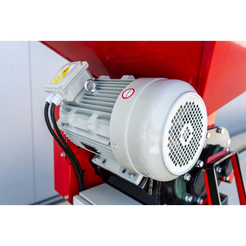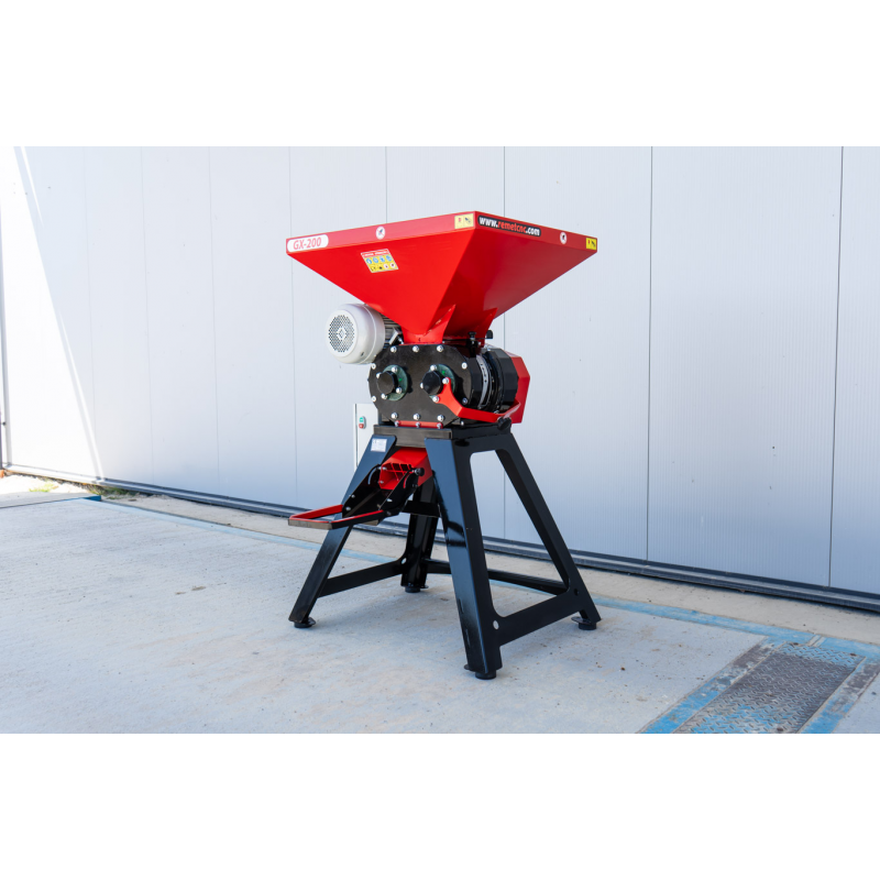 Sercem gniotownika jest silnik indukcyjny o mocy 7,5 kW, zasilany z sieci trójfazowej 400V. Napęd przekazywany jest przez trzy pasy klinowe, co zapewnia stabilną pracę walców zgniatających. Duża moc oraz solidna konstrukcja modelu GX-200 NEW sprawiają, że gniotownik jest w stanie obsłużyć większe ilości surowca. W zależności od rodzaju zboża maszyna może osiągnąć następujące parametry pracy: