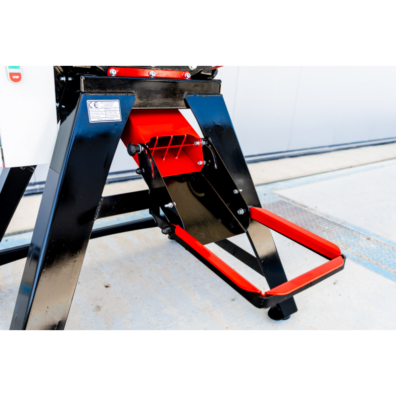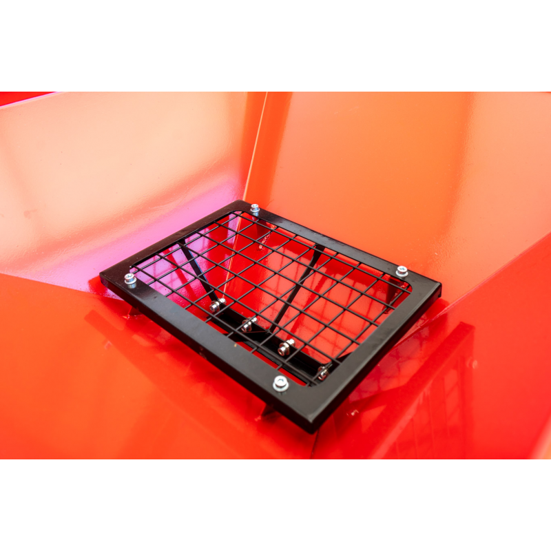 Kosz zasypowy posiada pojemność 110 litrów i wyposażony jest w regulowaną zasuwę dozującą, która pozwala precyzyjnie sterować ilością podawanego materiału.