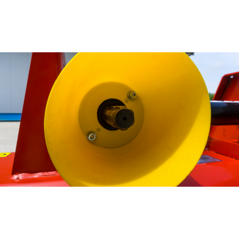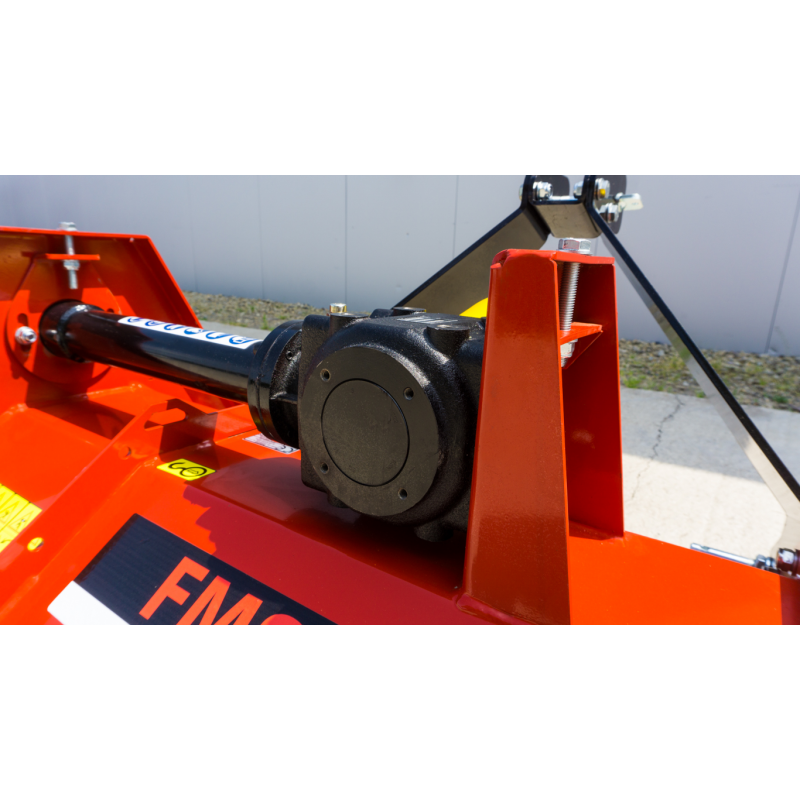 Oferowana kosiarka bijakowa FMS-120 wyposażona jest w jednostronny układ napędowy oparty na przekładni pasowej, zabezpieczonej osłonami. Przekładnia przenosi moc do 50 KM, co pozwala na efektywną pracę nawet przy większych obciążeniach. Zleca się, aby prędkość obrotowa wałka WOM wynosiła 540 obr./min. Dzięki temu ma miejsce optymalna wydajność koszenia. Elementy napędowe kosiarki są starannie zabezpieczone osłonami, co minimalizuje ryzyko wypadków.