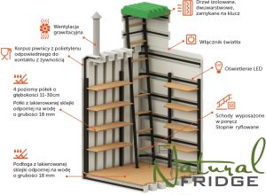 Korpus solidnie wykonany z wzmocnieniami w postaci profili oraz szeregiem półek które dodatkowo wzmacniaj konstrukcję piwniczki .