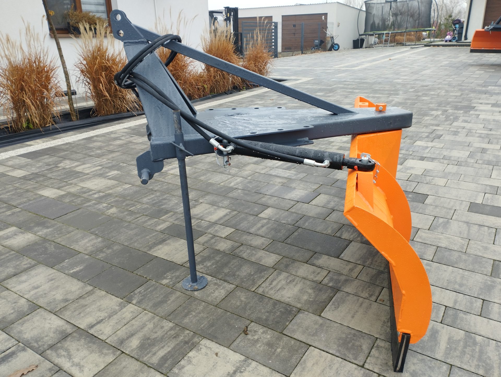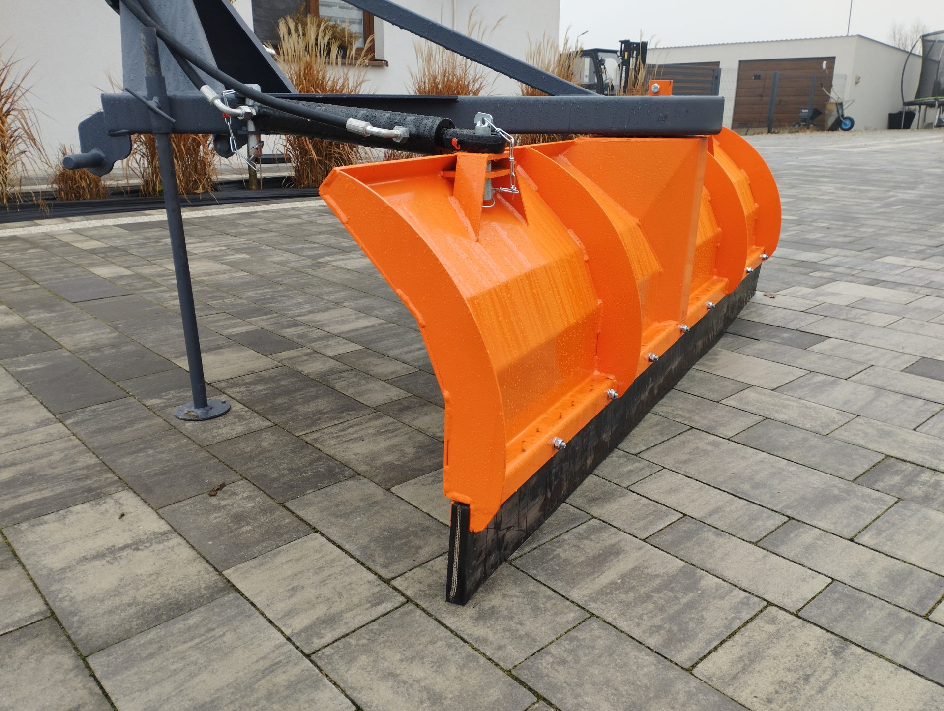 Lemiesz pługa wykonany z gumy o grubości 4 mm to gwarancja wysokiej odporności na zużycie. Konstrukcja lemiesza została wzmocniona blachą 3 mm, a także hokejami po bokach i z tyłu, co zapewnia stabilność i długowieczność urządzenia. Dzięki tym rozwiązaniom pług jest w stanie wytrzymać intensywną eksploatację przez długi czas.
