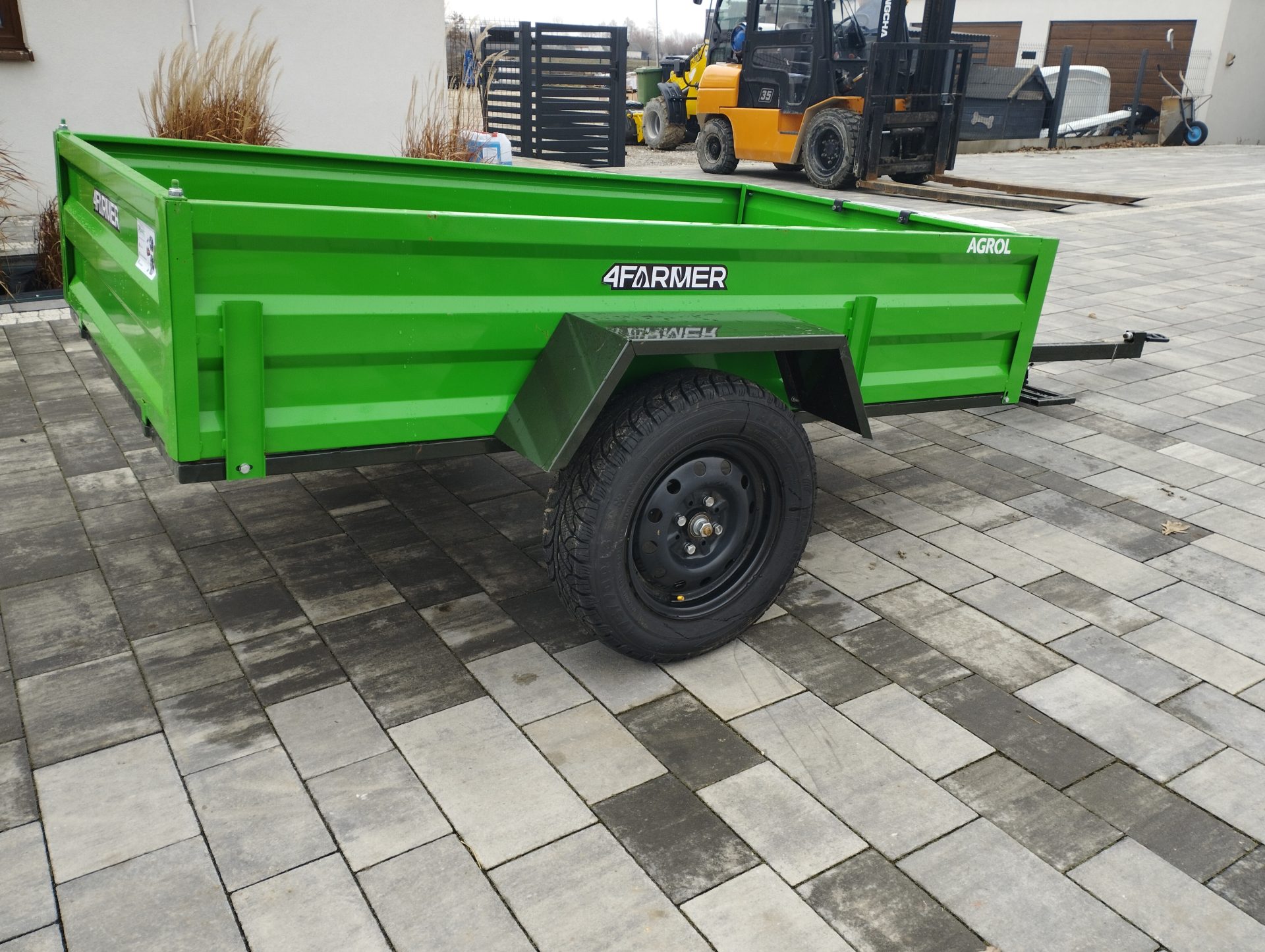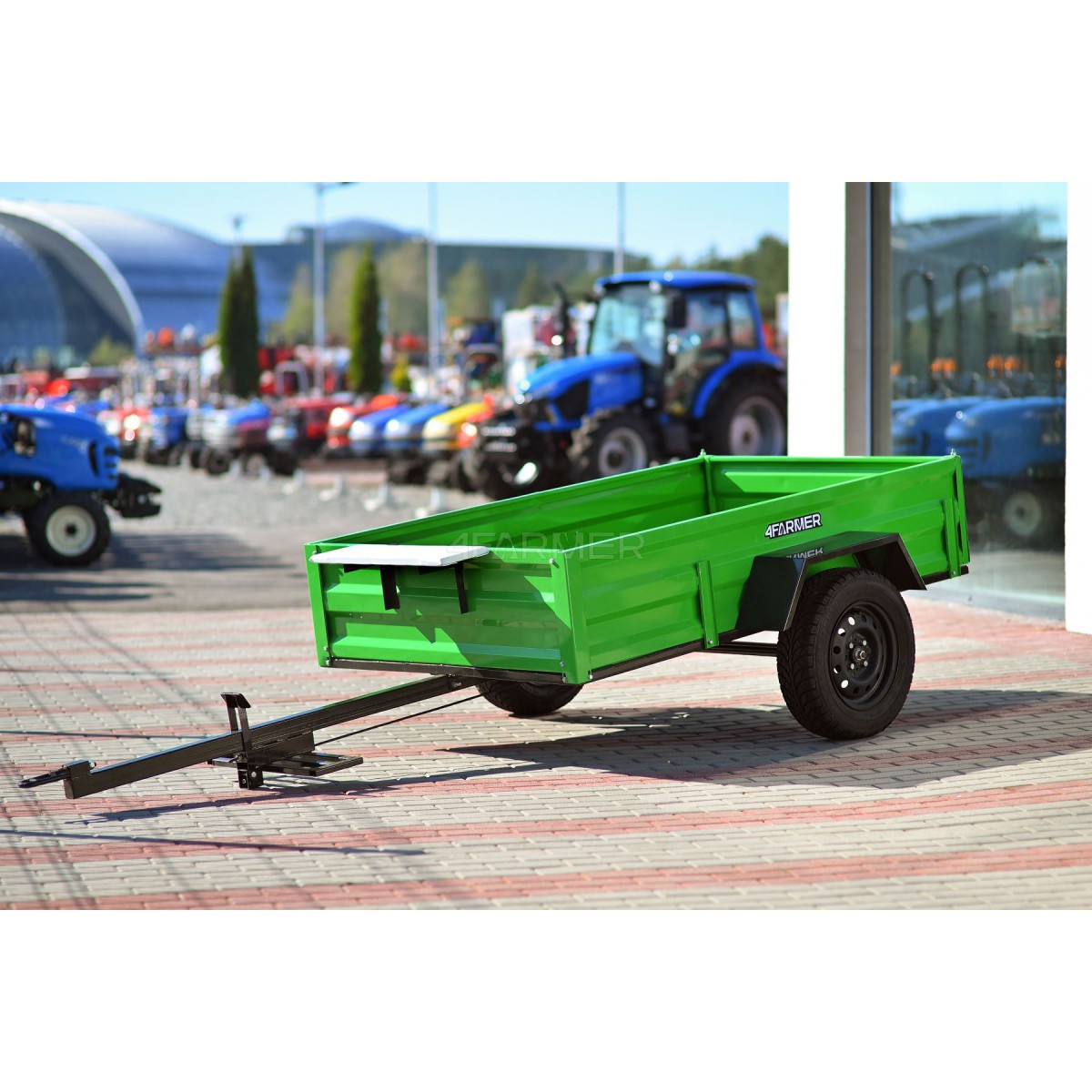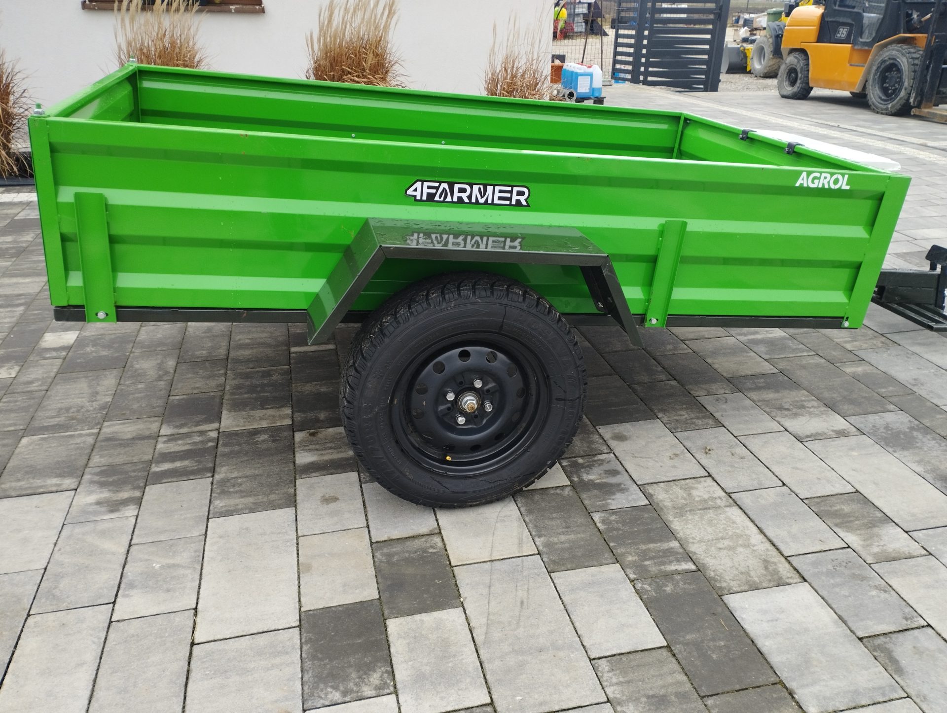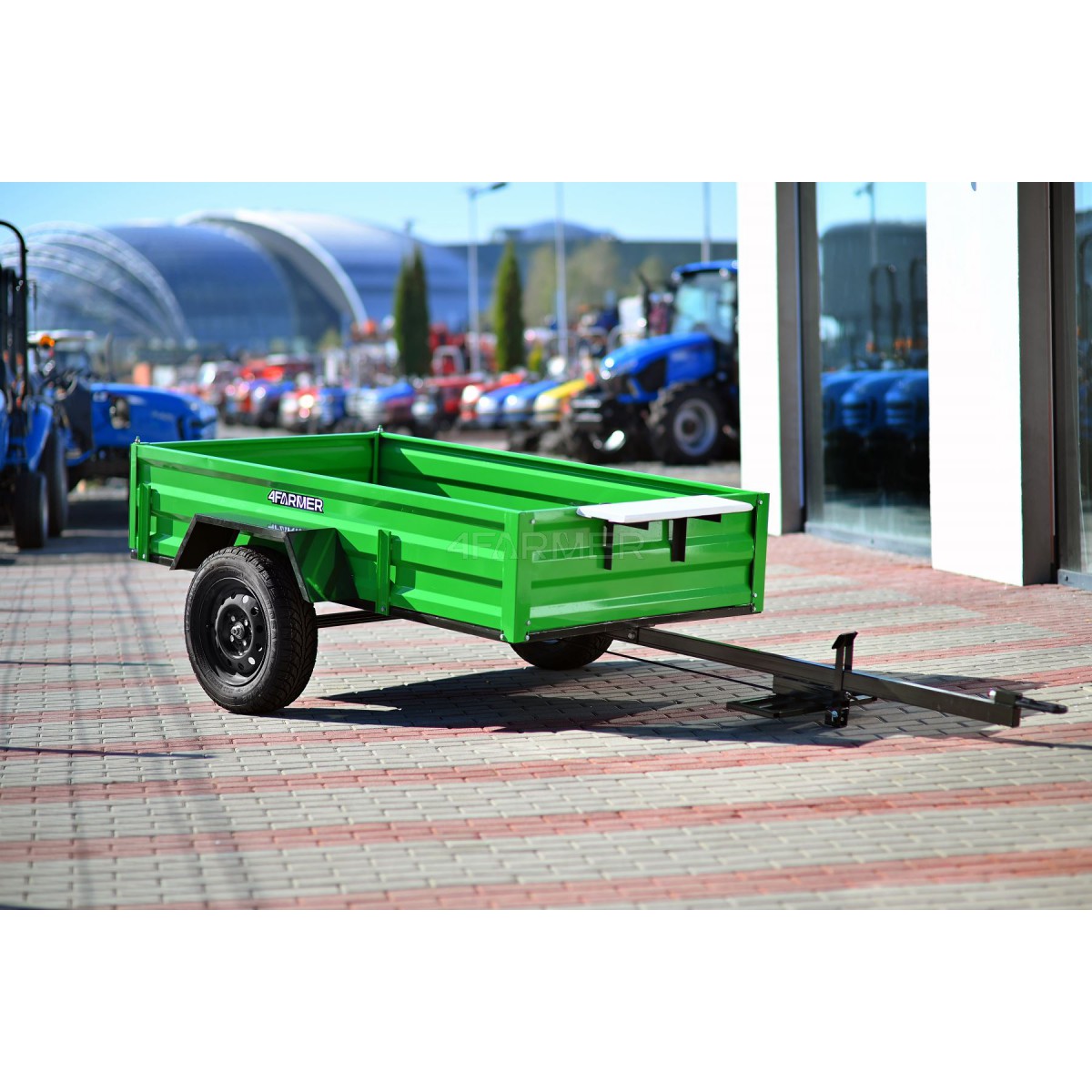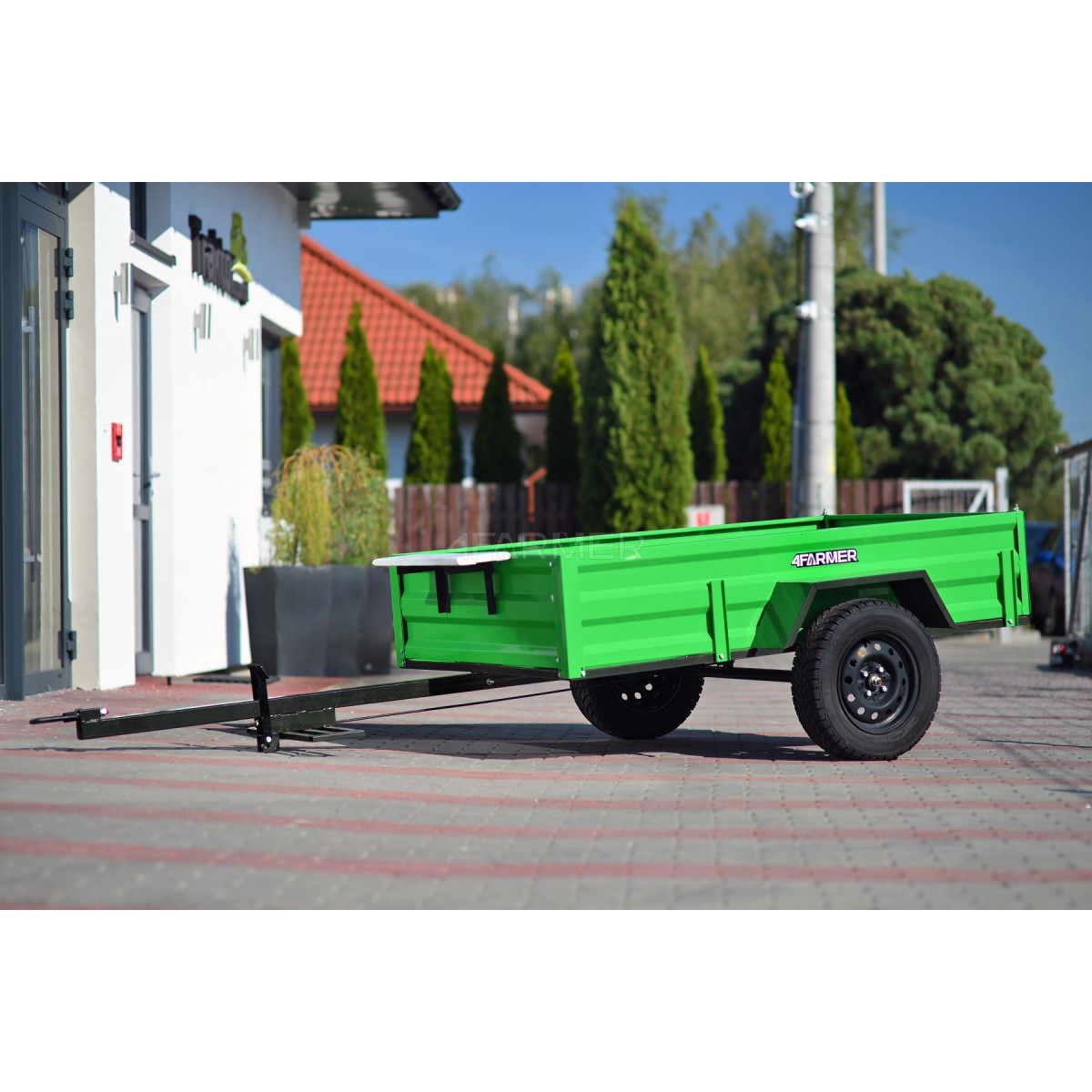 Oferowana przyczepka cenionej marki 4Farmer spełnia oczekiwania użytkowników, oferując bezproblemowe dostarczenie przewożonego materiału do celu. Jej ładowność wynosi 600 kg, natomiast długość całkowita wynosi 365 cm. Przyczepa jednoosiowa PT200 posiada przyjemny dla oka zielony kolor. Nie podlega ona rejestracji.