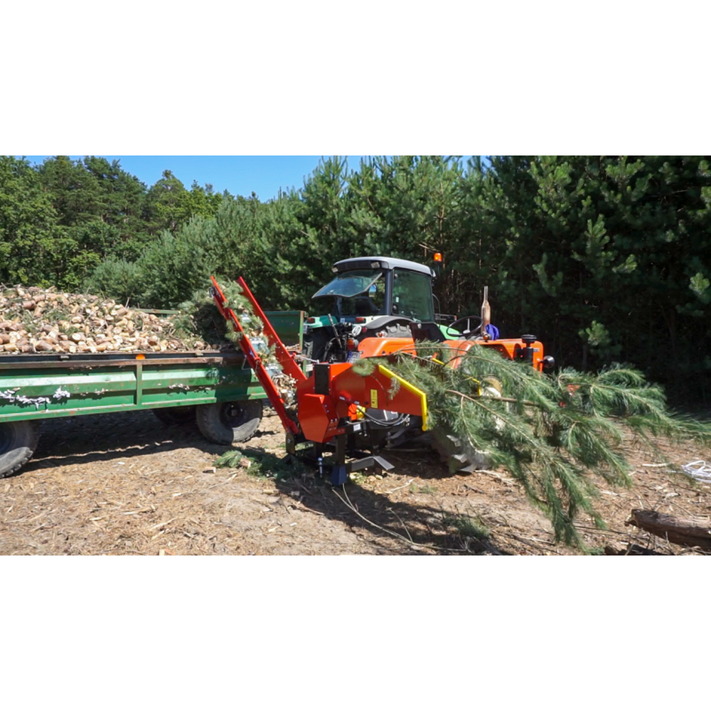 Dużą zaletą przedstawionego rębaka jest wyposażenie go w składany taśmociąg. Umożliwia on łatwy transport rozdrobnionego materiału. Nie ma potrzeby dodatkowej pracy operatora rębaka, czyli przenoszenie rozdrobnionych gałęzi z jednego miejsca na drugie. Gałęzie mogą trafiać w szybki sposób m.in na przyczepkę. Przenośnik taśmowy posiada długość aż 3 metrów.
