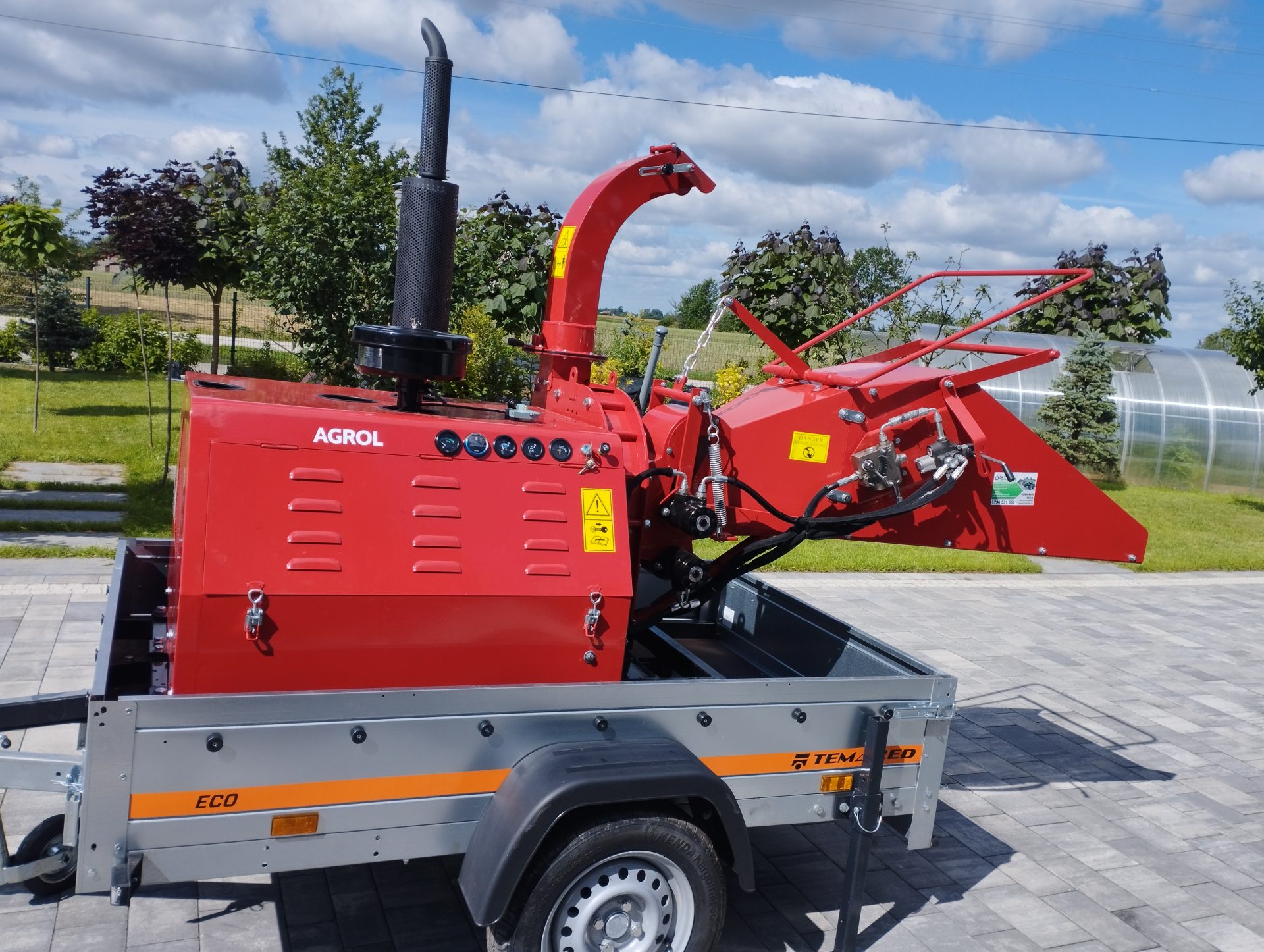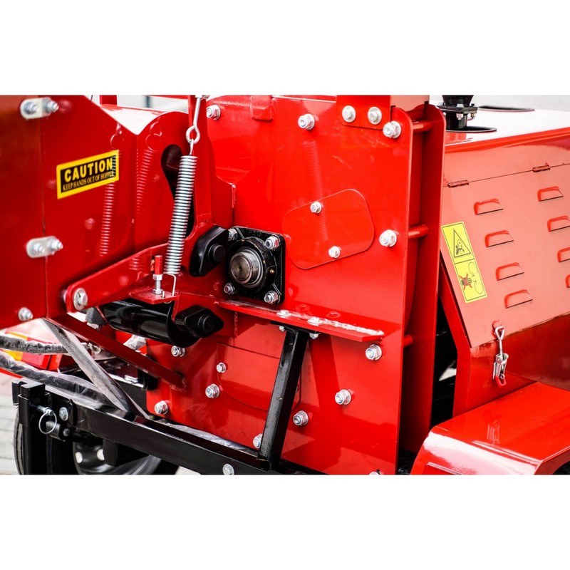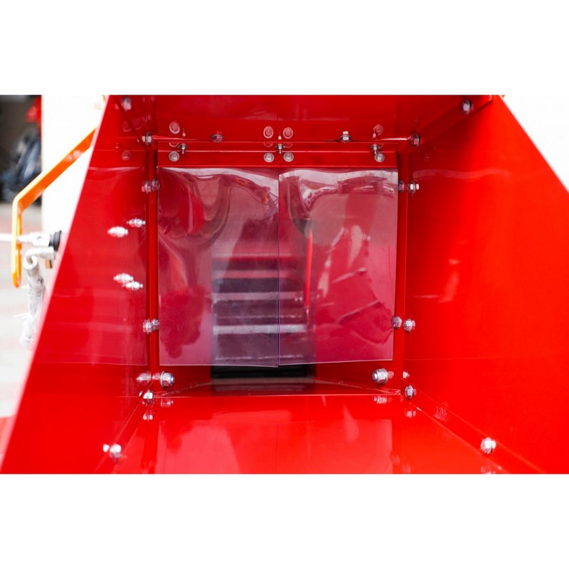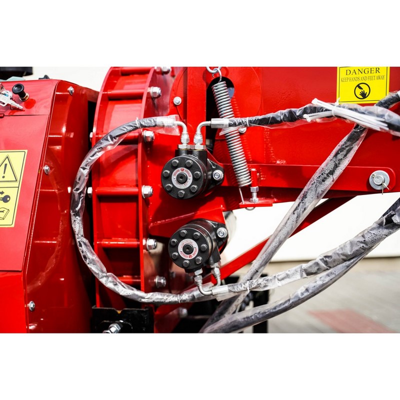 Kolejną kluczową cechą rozdrabniarki jest hydrauliczny podajnik. Ułatwia on proces wciągania gałęzi do maszyny. W celach bezpieczeństwa rębak posiada przycisk STOP. Pozwala to na natychmiastowe zatrzymanie pracy urządzenia w przypadku awaryjnej sytuacji.