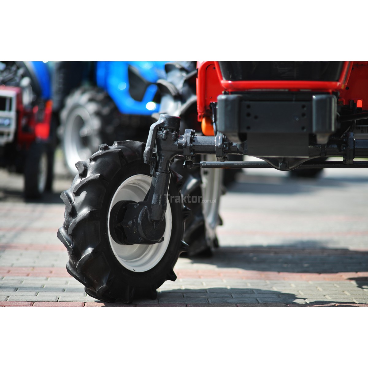 Yanmar AF226D charakteryzuje się dużym prześwitem wynoszącym 36 cm oraz oponami w rozmiarze 7-14 z przodu i 9.5-26 z tyłu, co nie tylko poprawia jego wygląd, ale także funkcjonalność. Długość traktora wynosi 2680 mm, a rozstaw osi 1440 mm, co zapewnia stabilność i komfort podczas pracy. Pomimo swojej masy wynoszącej 899 kg, traktor jest zwinny i łatwy w manewrowaniu, co jest szczególnie ważne w ciasnych przestrzeniach.