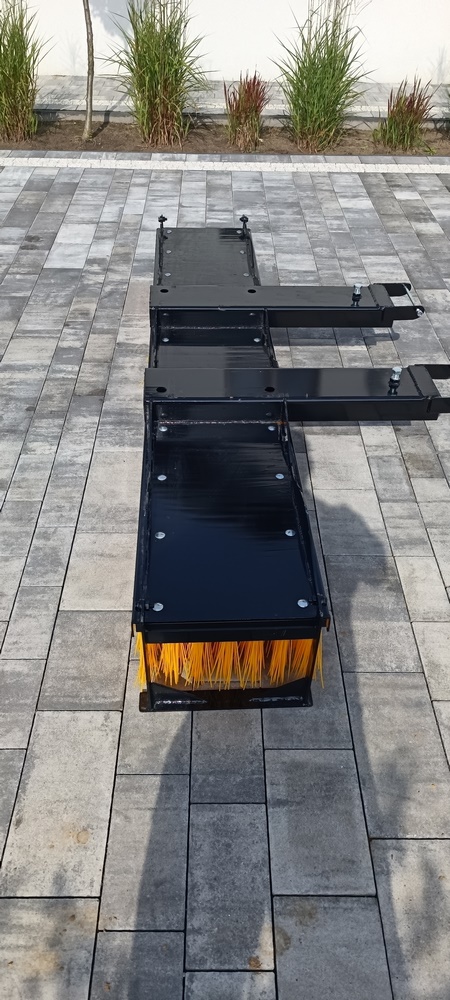 Zamiatarka mocowana jest bezpośrednio na widłach wózka widłowego, co gwarantuje stabilność i sztywność podczas pracy. Zabezpieczenie wideł (śruba + bolec z zawleczką) zapewnia dodatkową ochronę przed przesunięciem podczas manewrowania. Dodatkowo, zamiatarka jest wyposażona w podpórki, które umożliwiają łatwe odstawienie narzędzia, a także szybkie podpięcie do wózka widłowego.
